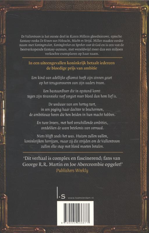 De Valkentroon is het eerste deel in Karen Millers gloednieuwe, epische fantasy-reeks De Kroon van Hebzucht, Macht en Strijd. Miller maakte eerder naam met Koningmaker, Koningbreker en Spreker voor de God, en is een van de bestverkopende fantasy-auteurs, met wereldwijd meer dan een miljoen verkochte exemplaren op haar naam.