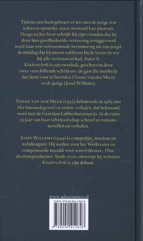 'Kinderschrik' is een tweeluik, geschreven door twee verschillende schrijvers: de gast die meehielp het feest voor te bereiden (Vonne van der Meer) en de jarige (Josef Willems).