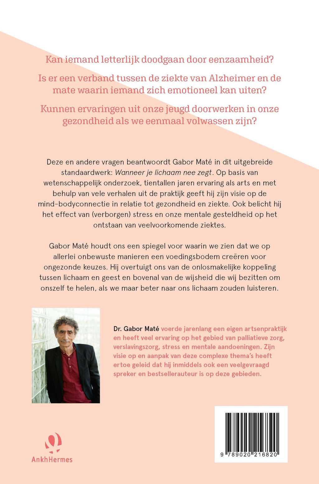 Gebaseerd op wetenschappelijk onderzoek en aan de hand van vele voorbeelden en verhalen uit zijn eigen huisartsenpraktijk en zijn werk in de palliatieve en verslavingszorg, geeft Maté antwoord op vragen over de rol die de mind-bodyconnectie speelt in het ontwikkelen van lichamelijke en geestelijke ziektes. Hij geeft overtuigend bewijs voor deze link en laat bovenal zien dat wij allemaal de wijsheid bezitten om onszelf te helen. Met 'Wanneer je lichaam nee zegt' kan ieder van ons zich afstemmen op de innerlijke wijsheid die we allemaal bezitten.