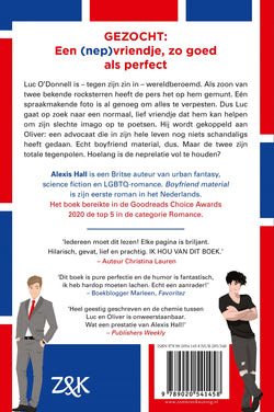 Luc, de hoofdpersoon in ‘Boyfriend Material’ van Alexis Hall, is de zoon van een wereldberoemde rockster en is op zoek naar een normaal, lief vriendje dat hem kan helpen om zijn slechte imago in de pers op te poetsen. Oliver is een advocaat die in zijn hele leven nog niets schandaligs heeft gedaan. Echt boyfriend material, dus. Ze zijn totale tegenpolen, maar ze maken een afspraak: zolang de pers achter Luc aanzit, zullen ze doen alsof ze een relatie hebben. Daarna hoeven ze elkaar nooit meer te zien. Maar het probleem is dat de neprelatie wel heel echt begint te voelen.