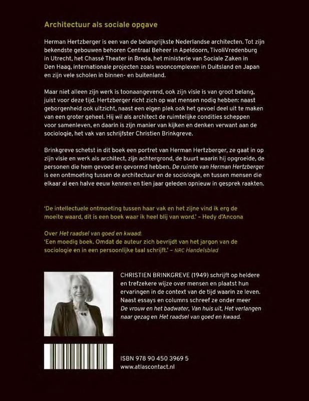 Maar niet alleen zijn werk is toonaangevend, ook zijn visie is van groot belang, juist voor deze tijd. Hertzberger richt zich op wat mensen nodig hebben: naast geborgenheid ook uitzicht, naast een eigen plek ook het gevoel deel uit te maken van een groter geheel. Hij wil als architect de ruimtelijke condities scheppen voor samenleven, en daarin is zijn manier van kijken en denken verwant aan de sociologie, het vak van schrijfster Christien Brinkgreve.