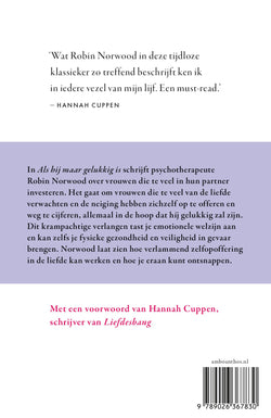 In Als hij maar gelukkig is schrijft psychotherapeute Robin Norwood over vrouwen die te veel in hun partner investeren. Het gaat om vrouwen die te veel van de liefde verwachten en de neiging hebben zichzelf op te offeren en weg te cijferen, allemaal in de hoop dat híj gelukkig zal zijn. Dit krampachtige verlangen tast hun emotionele welzijn aan en kan zelfs hun fysieke gezondheid en veiligheid in gevaar brengen. Robin Norwoord laat in Als hij maar gelukkig is zien hoe verlammend zelfopoffering in de liefde kan werken en hoe je eraan kunt ontsnappen.