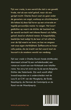 De wereld staat in brand. Dat klinkt duidelijk door in deze geëngageerde bundel, waarin de toestand van de wereld verweven wordt met de intieme thema's van liefde, geloof, dood en afscheid nemen. Tijd voor vrede. In een wereld die ziek is van geweld. Vrede, niet als een naïef geloof, maar als een gerijpt inzicht. Het bijzondere is dat Ducal de gevoelens van angst, wanhoop en uitzichtloosheid die helaas bij deze tijd horen op zo'n universele en tegelijk persoonlijke manier weet te vangen. In toegankelijke, beeldrijke taal nodigt deze bundel uit tot reflectie over de tijd waarin we leven, en hoe we omgaan met onze sterfelijkheid. Zelfbewuste en uiteindelijk hoopvolle poëzie ook, die de kracht van het woord inzet als houvast in de onzekere wereld van vandaag.
