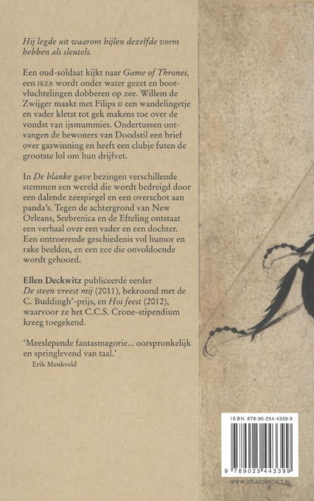 In 'De blanke gave' word je ondergedompeld in een wereld waar het water oprukt, moeders hun kinderen op het droge slepen en geliefden verdwijnen. De IKEA loopt onder en de A2 verandert in een heel kalm, groot kanaal: ‘op de tekentafel rust een atlas/ alvast atlantisblauw gekrast.’
