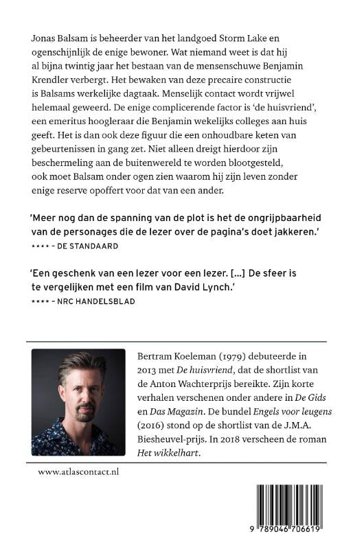 In ‘De huisvriend’ van Bertram Koeleman is Jonas Balsam beheerder van het landgoed Storm Lake en ogenschijnlijk de enige bewoner. Wat niemand weet is dat hij al bijna twintig jaar het bestaan van de mensenschuwe Benjamin Krendler verbergt. Het bewaken van deze precaire constructie is Balsams werkelijke dagtaak. Menselijk contact wordt vrijwel helemaal geweerd. De enige complicerende factor is ‘de huisvriend’, een emeritus hoogleraar die Benjamin wekelijks colleges aan huis geeft. Het is dan ook deze figuur die een onhoudbare keten van gebeurtenissen in gang zet. Niet alleen dreigt hierdoor zijn beschermeling aan de buitenwereld te worden blootgesteld, ook moet Balsam onder ogen zien waarom hij zijn leven zonder enige reserve opoffert voor dat van een ander.