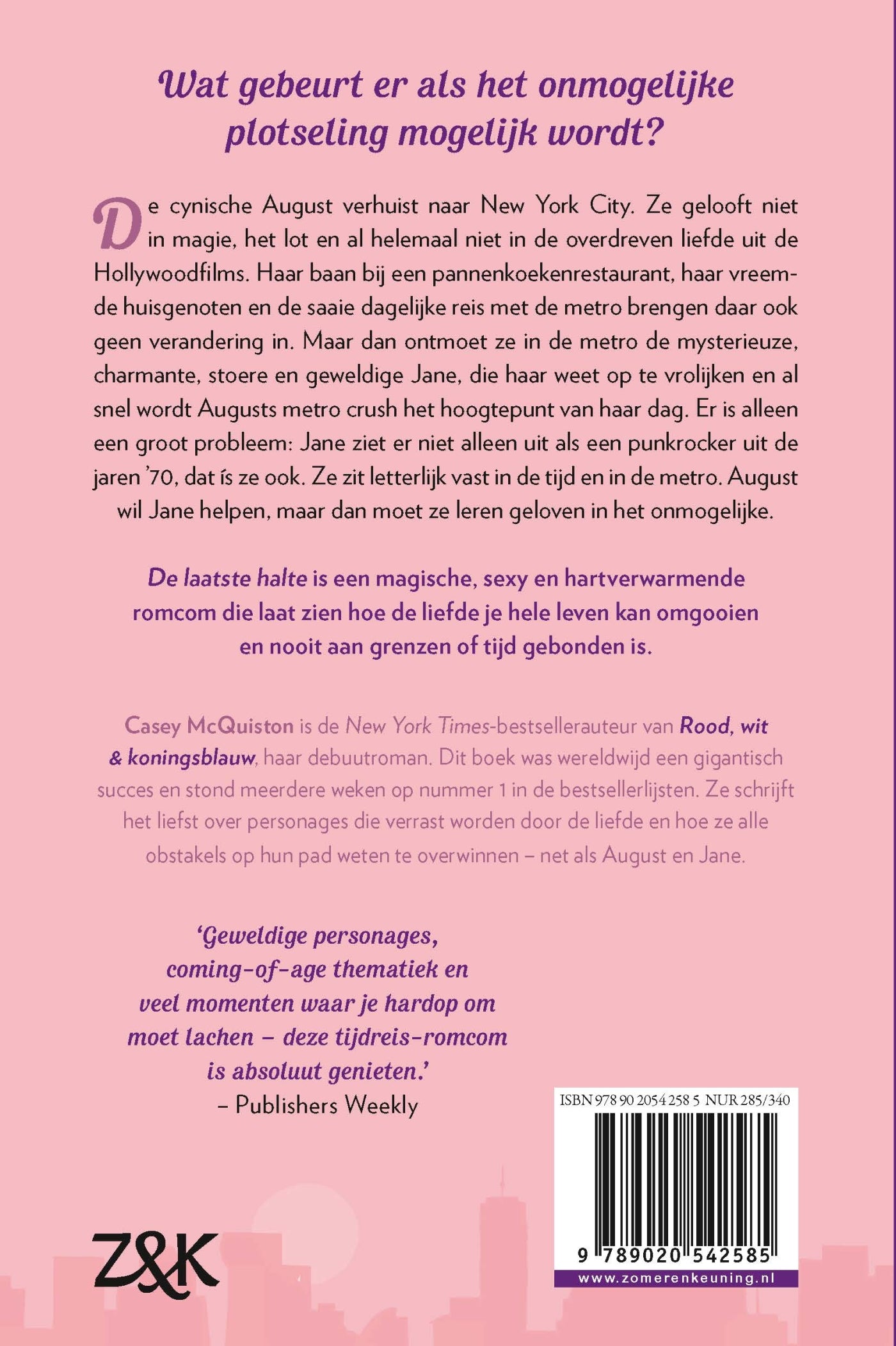 'De laatste halte' van bestsellerauteur Casey McQuiston gaat over de cynische August, die naar New York City verhuist. Ze gelooft niet in magie, het lot en de overdreven liefde uit de films. Maar dan ontmoet ze een geweldig meisje in de trein. De mysterieuze en charmante Jane weet August op te vrolijken. Er is alleen één groot probleem: Jane ziet er niet alleen uit als een rocker uit de jaren ’70, dat ís ze ook. Jane zit al jaren vast in de trein. August wil haar helpen, maar dan moet ze wel leren geloven in het onmogelijke. 'De laatste halte' van Casey McQuiston is een unieke roman met humor, romance én tijdreizen. Eerder verscheen van McQuiston de populaire rom-com 'Rood, wit & koningsblauw'.