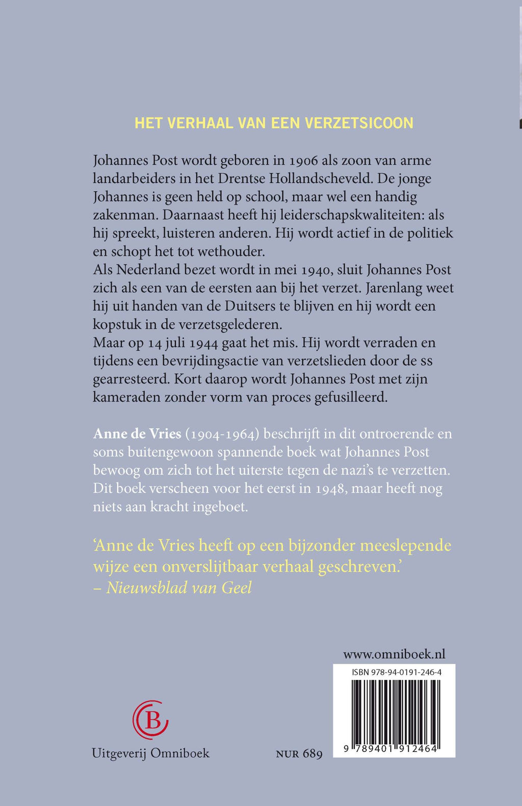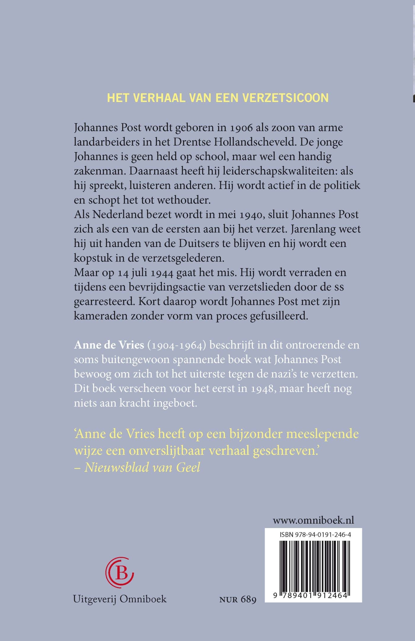 Boeiende roman over het leven van een van de grootste leiders uit het Nederlandse verzet. Johannes Post wordt geboren in 1906 in het Drentse Hollandscheveld als zoon van een arme zandboer. Hij is geen uitblinker op school, maar wel een handig zakenman met leiderschapskwaliteiten. Hij wordt actief in de politiek en schopt het tot wethouder. In mei 1940 is hij één van de eersten die zich aansluit bij het verzet. Jarenlang blijft hij uit handen van de Duitsers. Totdat hij verraden wordt op 14 juli 1944, als de oorlog bijna afgelopen is. Anne de Vries tekent in dit ontroerende en spannende boek het levensverhaal op van een van Nederlands bekendste verzetshelden.