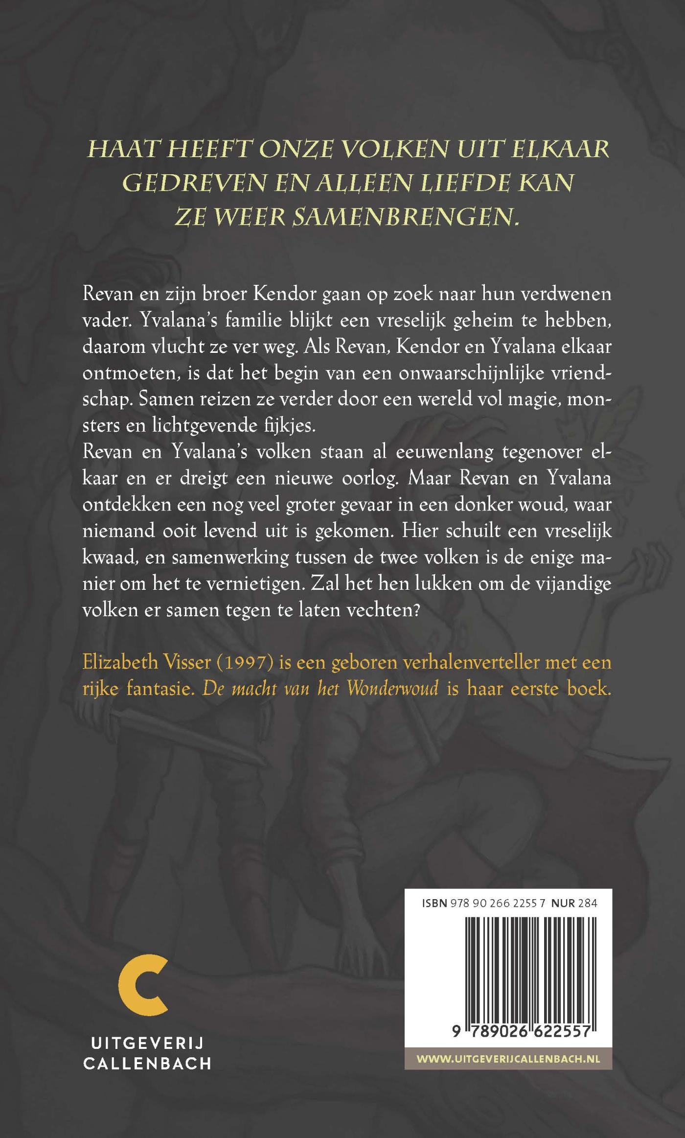 ‘De macht van het Wonderwoud’ is het spannende fantasy-debuut van Elizabeth Visser. Revan en Yvalana wonen ieder aan een kant van het magische Wonderwoud. Hun twee volken voeren al eeuwenlang oorlog om de magie van dit woud, maar ze kunnen elkaar nooit verslaan. Door de moord op de koningin van de Ershai dreigt er een nieuwe oorlog, en deze oorlog zal alles veranderen. Revan en Yvalana komen erachter dat deze oorlog niet het grootste kwaad is. Ze verdwalen in een donker woud, waar niemand ooit levend uit is gekomen. Hier komen ze achter geheimen die het woud lang heeft verborgen. 'De macht van het Wonderwoud’ is een spannend en magisch verhaal met tekst en illustraties van Elizabeth Visser.