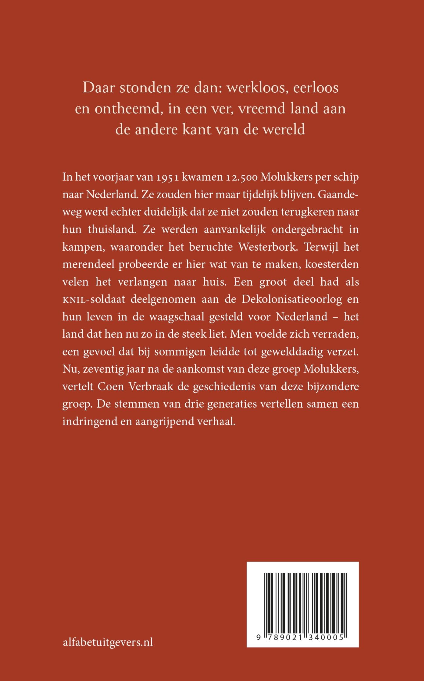 hun thuisland. Ze werden aanvankelijk ondergebracht in kampen, waaronder het beruchte Westerbork. Terwijl het merendeel probeerde er hier wat van te maken, koesterden velen het verlangen naar huis. Een groot deel had als KNIL-soldaat deelgenomen aan de Dekolonisatieoorlog en hun leven in de waagschaal gesteld voor Nederland – het land dat hen nu zo in de steek liet. Men voelde zich verraden, een gevoel dat bij sommigen leidde tot gewelddadig verzet. Nu, zeventig jaar na de aankomst van deze groep Molukkers, vertelt Coen Verbraak de geschiedenis van deze bijzondere groep. De stemmen van drie generaties vertellen samen een indringend en aangrijpend verhaal.