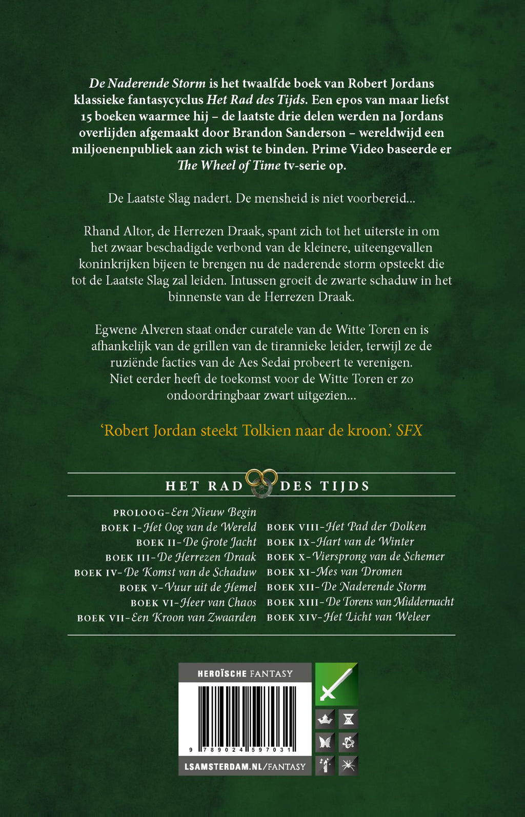De Naderende Storm is het twaalfde boek van Robert Jordans klassieke fantasycyclus Het Rad des Tijds. Een epos van maar liefst 15 boeken waarmee hij – de laatste drie delen werden na Jordans overlijden afgemaakt door Brandon Sanderson – wereldwijd een miljoenenpubliek aan zich wist te binden. Prime Video baseerde er de tv-serie The Wheel of Time op.