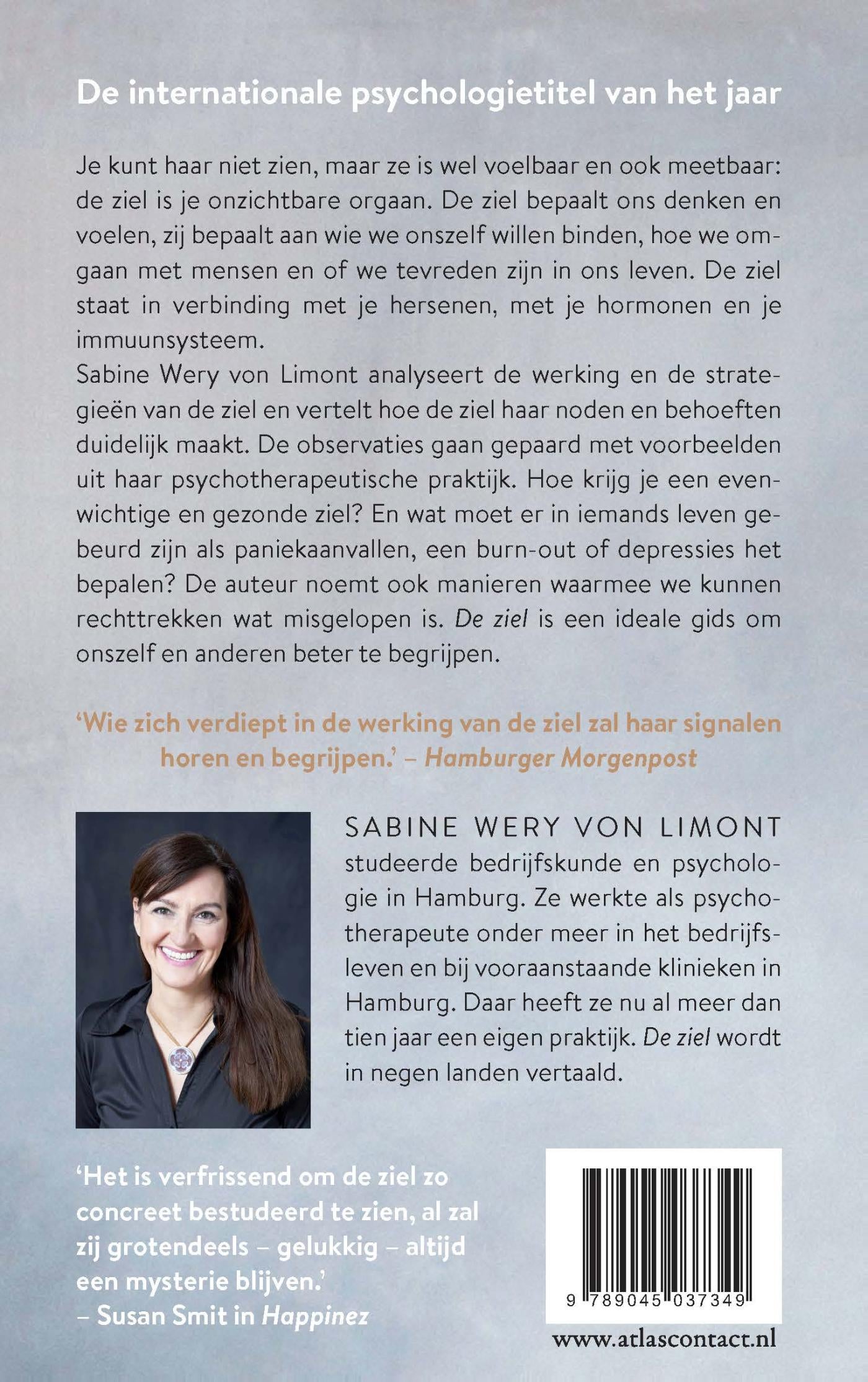 Sabine Wery von Limont analyseert in ‘De ziel’ de werking en de strategieën van de ziel en vertelt hoe de ziel haar noden en behoeften duidelijk maakt. Je kunt haar niet zien, maar ze is wel voelbaar en ook meetbaar: de ziel is je onzichtbare orgaan. De ziel bepaalt ons denken en voelen, zij bepaalt aan wie we onszelf willen binden, hoe we omgaan met mensen en of we tevreden zijn in ons leven. De ziel staat in verbinding met je hersenen, je hormonen en je immuunsysteem.