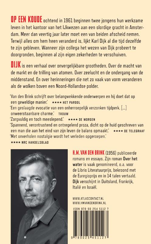 Het verhaal 'Dijk' van H.M. van den Brink begint op een koude ochtend in 1961 wanneer twee jongens hun werkzame leven beginnen in een kantoor aan een slordige gracht in Amsterdam. Meer dan veertig jaar later moet een van beiden afscheid nemen. Terwijl alles om hem heen veranderd is, lijkt Karl Dijk al die tijd dezelfde te zijn gebleven. Maar juist dat maakt hem zo raadselachtig. Waarom verschijnt Dijk niet op zijn eigen afscheidsreceptie? Is meegaandheid soms niet beter dan het vasthouden aan principes? Wanneer zijn collega op zoek gaat naar het antwoord op die vragen, beginnen al zijn eigen zekerheden te verschuiven. 'Dijk' is een verhaal over onvergelijkbare grootheden. Over de macht van de markt en de trilling van atomen. Over zeelucht en de ondergang van slagers, kaasboeren en kruideniers. Over de standaardkilo van platina en iridium die voor de eeuwigheid bewaard wordt in een kluis nabij Parijs. En over herinneringen die net zo vaak van vorm veranderen als de wolken boven een Noord-Hollandse polder.