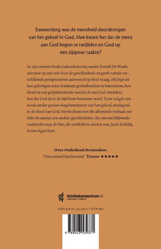 ‘Godenschemering’ van Daniël de Waele is een theologische cultuurgeschiedenis die de evolutie van het geloof in God uitdiept in de loop der tijd. Israël ontdekte in een polytheïstische wereld de Ene God, die door de tijd heen steeds humaner werd en dichterbij kwam. Hoe is het geloof na die grote stap geëvolueerd? Hoe past het verdampen van het geloof, dat uiteindelijk eindigde in de dood van God, in deze evolutie? En welke rol heeft het bestormen van de godenbeelden gespeeld? De Waele ontwaart naast deze geloofsevolutie een andere geschiedenis: een blijvende zoektocht naar de ene God.