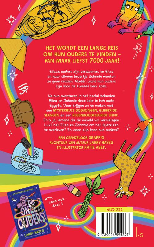 Deze keer belanden Eliza en Johnnie tijdens hun zoektocht in het oude Egypte. Onderweg krijgen ze te maken met vriendelijke Egyptenaren, een mysterieuze jonge god, glibberige slangen, een regenboogkleurige sfinx en zelfs iemand die de wereld wil vernietigen. Lukt het hun om hun ouders te vinden? En belangrijker nog: kunnen ze weer terug naar de toekomst reizen?