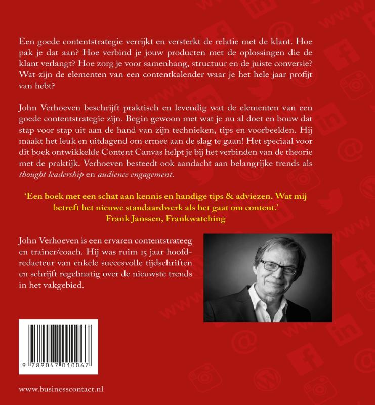 Verhoeven beschrijft praktisch en levendig wat de elementen van een goede contentstrategie zijn. Begin gewoon met wat je nu al doet en bouw dat stap voor stap uit aan de hand van zijn technieken, tips en voorbeelden. Hij maakt het leuk en uitdagend om ermee aan de slag te gaan! Het speciaal voor dit boek ontwikkelde Content Canvas helpt je bij het verbinden van de theorie met de praktijk. Verhoeven besteedt ook aandacht aan belangrijke trends als 'thought leadership' en 'audience engagement'.
