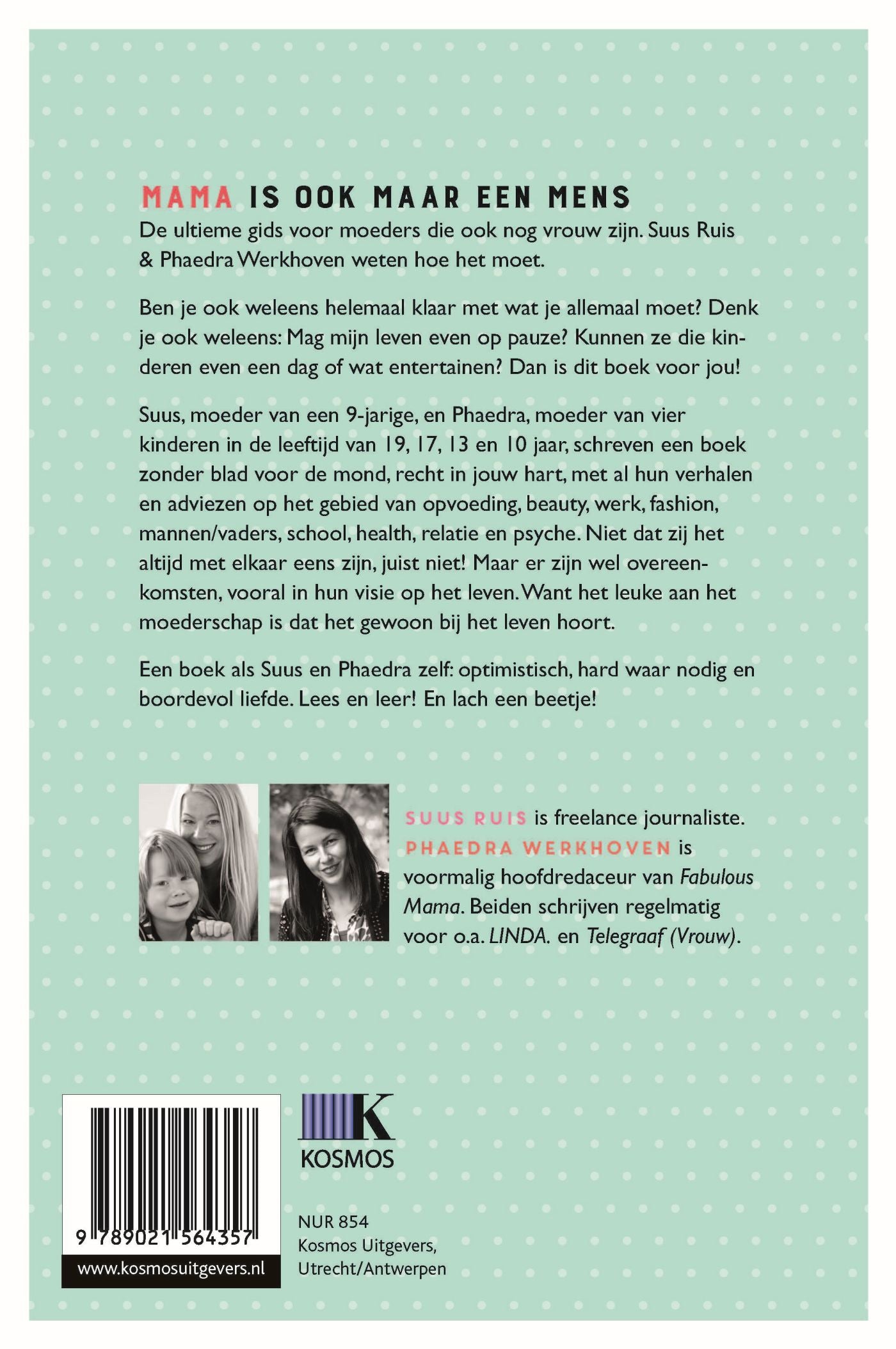 Mama is ook maar een mens van Suus Ruis en Phaedra Werkhoven is de ultieme gids voor moeders die ook nog vrouw zijn. Als moeder word je continu voor keuzes gesteld. En door de brij aan meningen kun je behoorlijk vastlopen. Klaar met dat moedergemuts: Suus en Pheadra leggen uit hoe het moet! Scherp maar met een knipoog geven zij hun ongezouten mening over de trends op het gebied van opvoeding, mannen, relaties, werk en beauty.