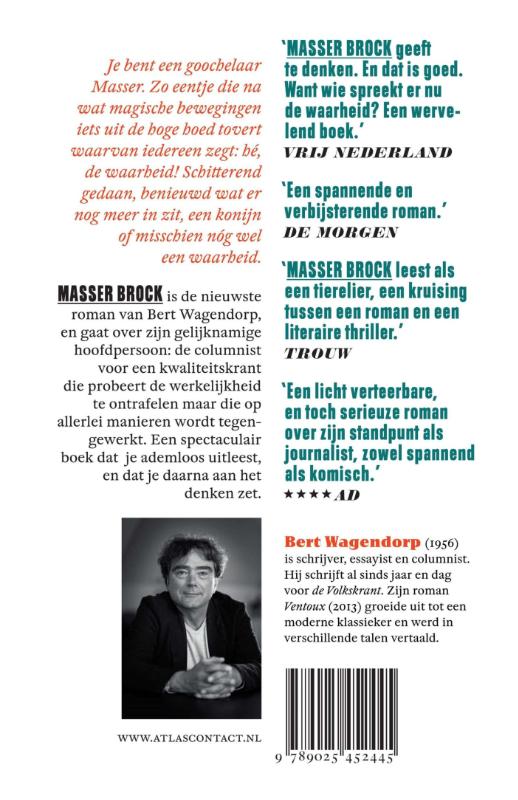 ‘Masser Brock’ is de spectaculaire nieuwe roman van Bert Wagendorp, een wervelend verhaal over een columnist in het hedendaagse meningencircus, waarin de waarheid ook maar een opvatting is.