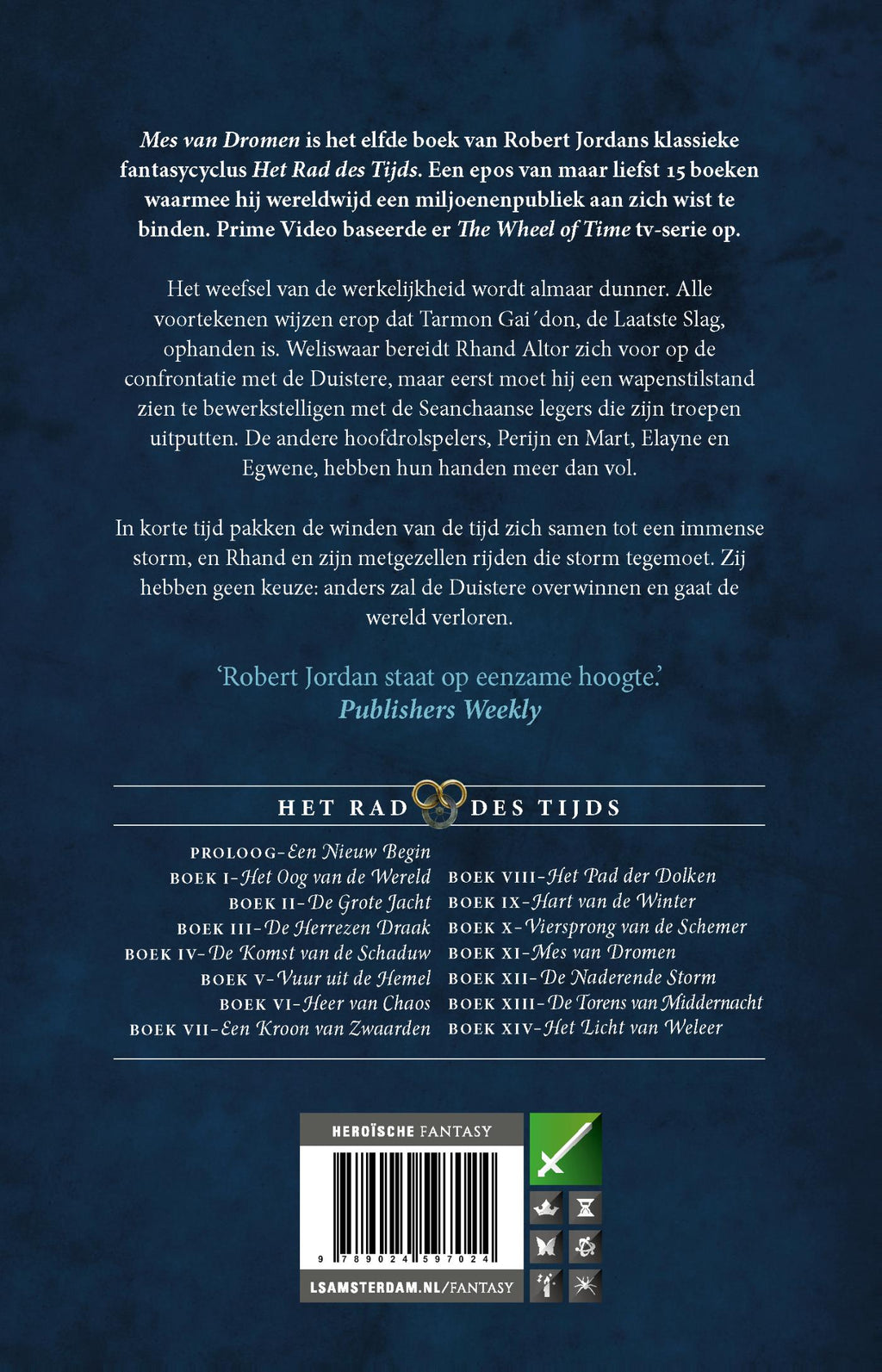 Mes van Dromen is het elfde boek van Robert Jordans klassieke fantasycyclus Het Rad des Tijds. Een epos van maar liefst 15 boeken waarmee hij wereldwijd een miljoenenpubliek aan zich wist te binden. Prime Video baseerde er de tv-serie The Wheel of Time op.