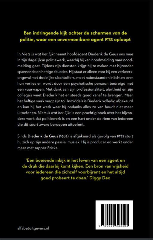Zeventien jaar lang werkte Diederik de Geus bij de politie Noord-Holland Noord. In Niets is wat het lijkt neemt hij ons mee in zijn dagelijkse politiewerk, waarbij hij van noodmelding naar noodmelding gaat. Tijdens zijn diensten krijgt hij met veel mooie mensen te maken, maar ook met bijzonder spannende en heftige situaties. Zo staat Diederik de ene keer in zijn eentje bij een ongeval met negen slachtoffers waaronder twee doden, moet hij regelmatig nabestaanden inlichten over hun verlies en wordt er bij een andere melding van dichtbij een vuurwapen op hem gericht door een psychotische persoon. Met dank aan zijn professionaliteit, alertheid en zijn collegas weet hij het er steeds goed vanaf te brengen. Maar het heftige werk vergt zijn tol: Diederik ontwikkelt PTSS. Inmiddels is hij volledig afgekeurd en kan hij het werk waar hij ondanks alles zo van houdt niet meer uitoefenen.