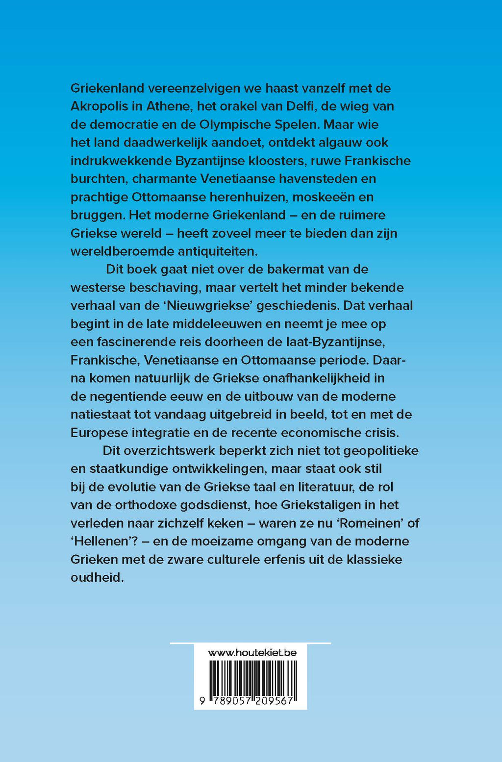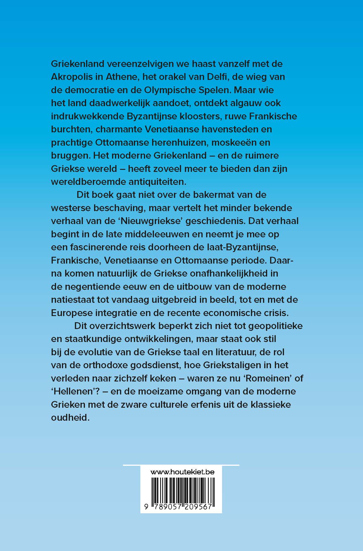 Dit boek gaat niet over de bakermat van de westerse beschaving, maar vertelt het minder bekende verhaal van de ‘Nieuwgriekse’ geschiedenis. Dat verhaal begint in de late middeleeuwen en neemt je mee op een fascinerende reis doorheen de laat-Byzantijnse, Frankische, Venetiaanse en Ottomaanse periode. Daarna komen natuurlijk de Griekse onafhankelijkheid in de negentiende eeuw en de uitbouw van de moderne natiestaat tot vandaag uitgebreid in beeld, tot en met de Europese integratie en de recente economische crisis.