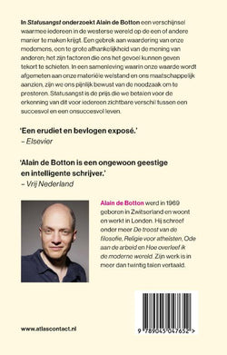 In Statusangst onderzoekt Alain de Botton een verschijnsel waarmee iedereen in de westerse wereld op de een of andere manier te maken krijgt. Een gebrek aan waardering van onze medemens, een te grote afhankelijkheid van de mening van anderen; het zijn allemaal factoren die ons het gevoel kunnen geven tekort te schieten. In een samenleving waarin onze waarde wordt afgemeten aan onze materiële wapenfeiten en ons maatschappelijk aanzien, zijn we ons pijnlijk bewust van de noodzaak om te presteren. Statusangst is de prijs die we betalen voor de erkenning van dit voor iedereen zichtbare verschil tussen een succesvol en een onsuccesvol leven.