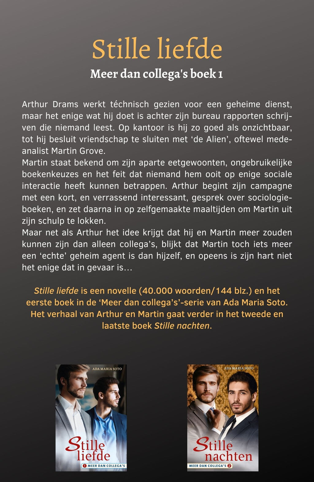 'Stille liefde' is een novelle (40.000 woorden/144 blz.) en het eerste boek in de ‘Meer dan collega’s’-serie van Ada Maria Soto. Het verhaal van Arthur en Martin gaat verder in het tweede en laatste boek 'Stille nachten'.