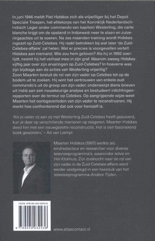 In juni 1946 meldt Piet Hidskes zich als vrijwilliger bij het Depot Speciale Troepen, het elitekorps van het Koninklijk Nederlandsch-Indisch Leger (knil) onder commando van kapitein Westerling, die carte blanche krijgt om de opstand in Indonesië neer te slaan en zuiveringsacties uit te voeren. Na zes maanden training wordt Hidskes ingezet op Zuid-Celebes in wat later ‘de Zuid-Celebes-affaire’ zal heten. Wat hier precies is voorgevallen vertelt Hidskes aan niemand, wie zou hem geloven? Als hij in 1992 overlijdt, neemt hij het verhaal mee in zijn graf. Waarom zweeg Hidskes vijftig jaar over zijn ervaringen op Zuid-Celebes? In hoeverre was zijn bijdrage aan de acties van Westerling vrijwillig? Zoon Maarten besluit de rol van zijn vader op Celebes tot op de bodem uit te zoeken. Hij wint het vertrouwen van enkele oud-commando’s uit de groep van zijn vader, onderwerpt diens brieven uit Indië aan een nauwkeurige analyse en bestudeert inlichtingenrapporten over de terreur op Celebes. Op aangrijpende wijze weet Maarten het oorlogsverleden van zijn vader te reconstrueren en merkt hoe confronterend dat ook voor hemzelf is.