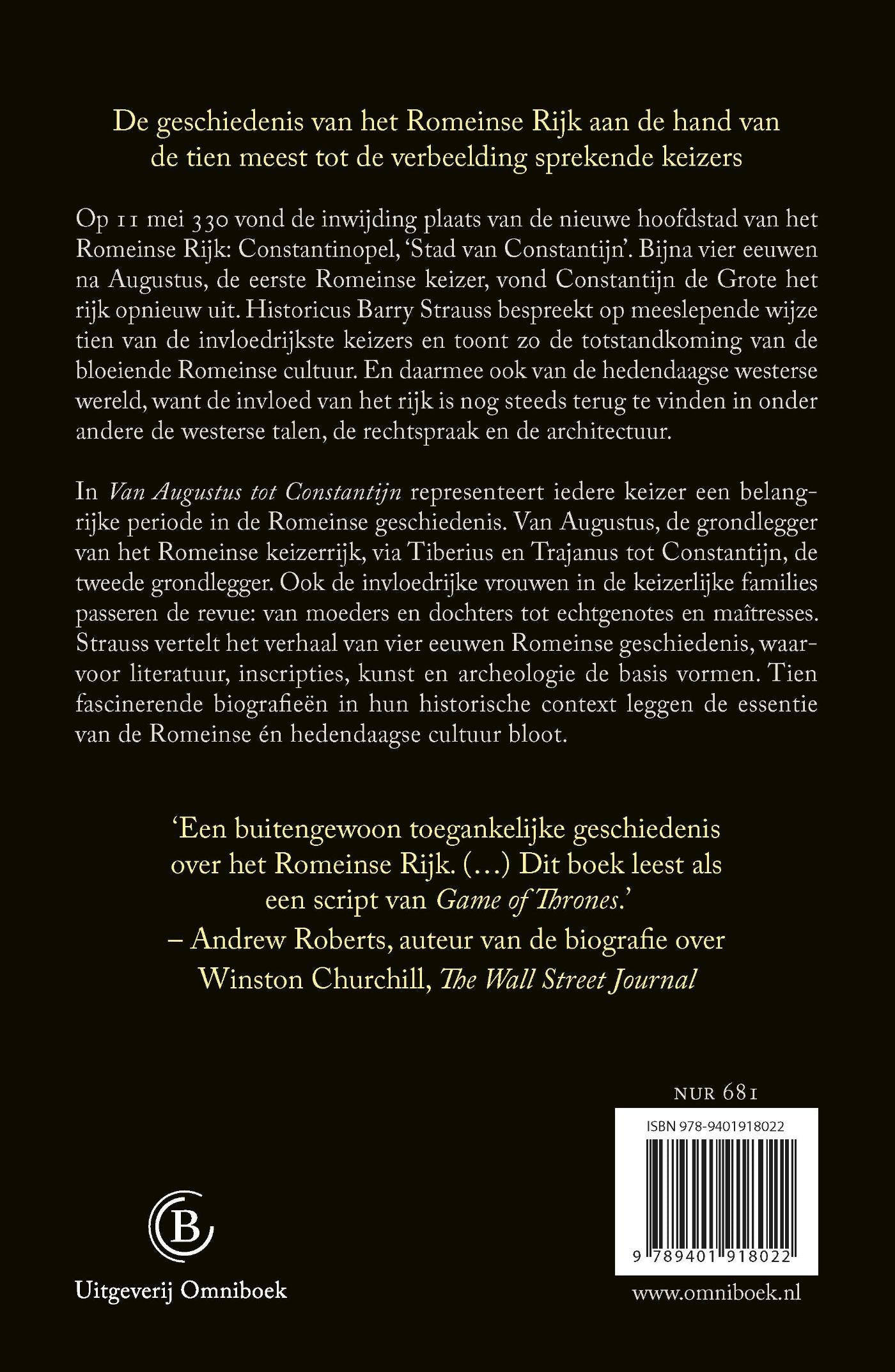 In ‘Van Augustus tot Constantijn’ vertelt Barry Strauss op toegankelijke wijze de complexe geschiedenis van Rome. Aan de hand van tien portretten van de meest tot de verbeelding sprekende figuur, de Romeinse keizer, brengt hij vier eeuwen geschiedenis tot leven. Alle tien keizers – Augustus, Tiberius, Nero, Vespasianus, Trajanus, Hadrianus, Marcus Aurelius, Septimus Severus, Diocletianus en Constantijn – representeren een belangrijke periode van het ooit zo machtige wereldrijk. Strauss maakt de geschiedenis van de klassieke oudheid daarmee behapbaar voor een breed publiek.
