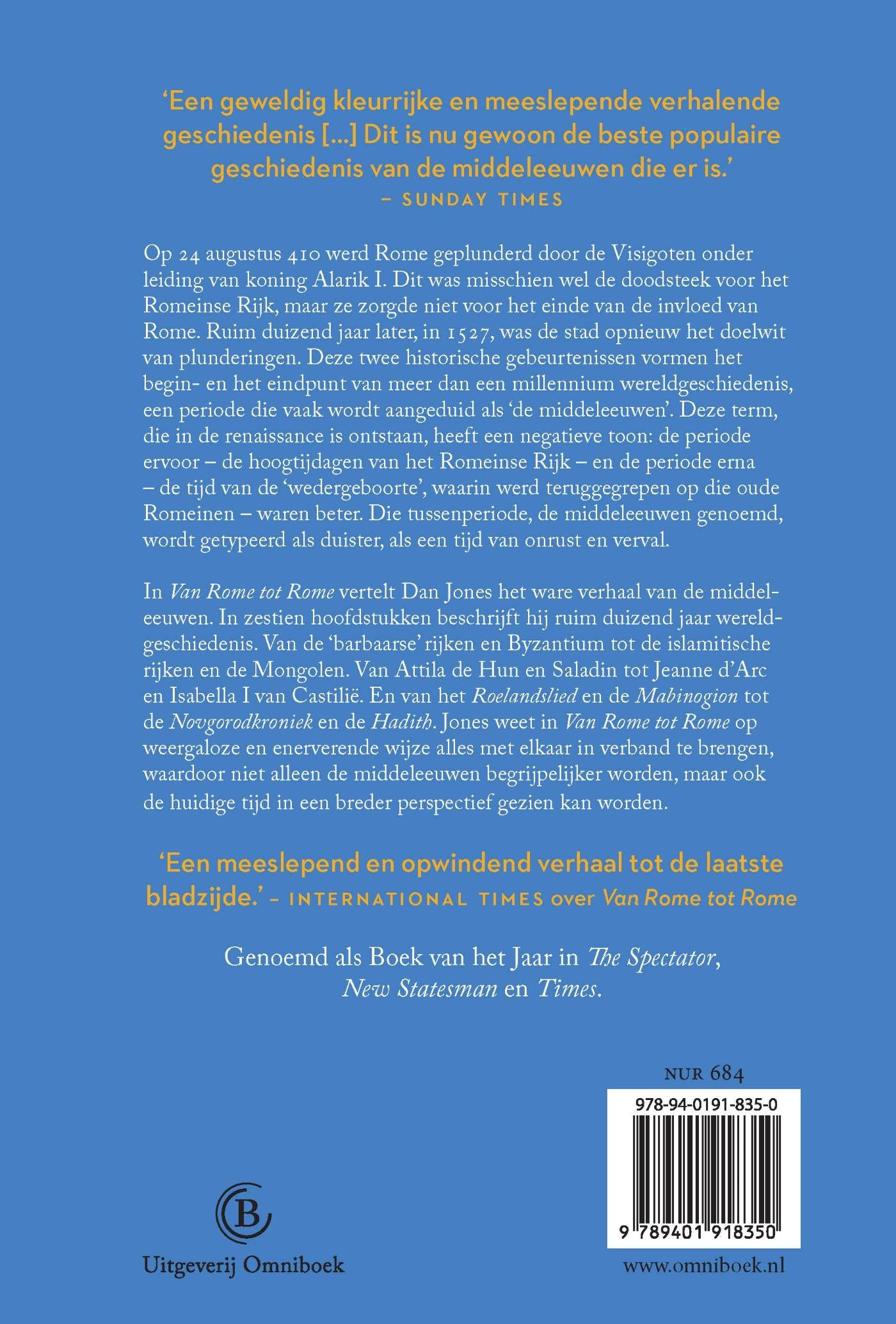 Een duizendjarig avontuur, dat is wat bestsellerauteur Dan Jones maakt van zijn nieuwe geschiedenis van de middeleeuwen ‘Van Rome tot Rome’. Hij begint in 410 bij de ineenstorting van het Romeinse Rijk en eindigt weer in Rome als keizer Karel V in de zestiende eeuw opnieuw voor de poorten van de stad staat. In een duizelingwekkend tempo laat Jones zien hoe het Westen de oude wereld herbouwde en de rest van de wereld ging domineren: door te ontdekken, ontwikkelen of domweg te stelen. ‘Van Rome tot Rome’ is een boek over – en voor – een tijd van diepgaande verandering.