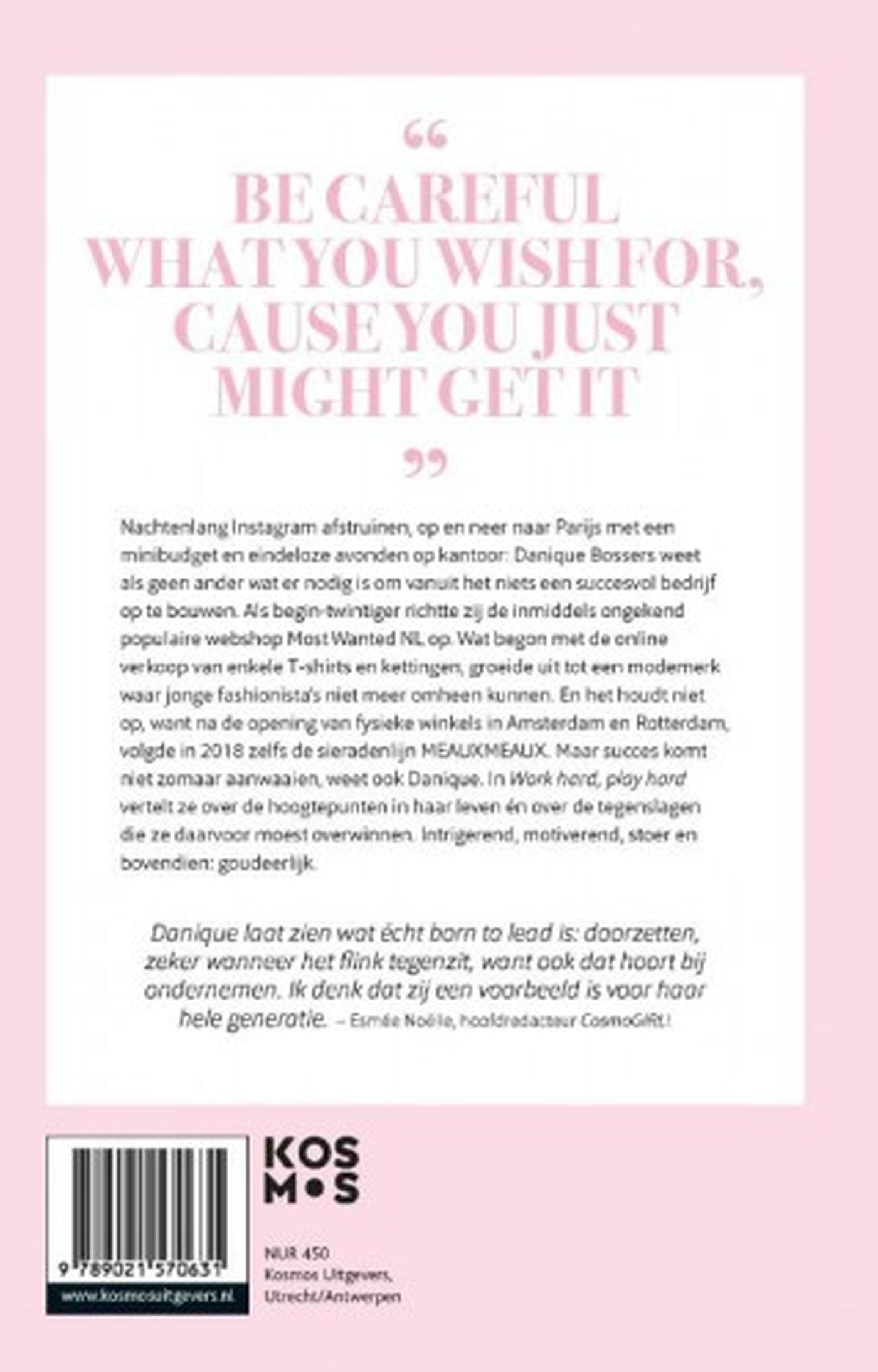 Nachtenlang Instagram afstruinen, op en neer naar Parijs met een minibudget en eindeloze avonden op kantoor: Danique Bossers weet als geen ander wat er nodig is om vanuit het niets een succesvol bedrijf op te bouwen. Als begin-twintiger richtte zij de inmiddels ongekend populaire webshop MostWanted op. Wat begon met de online verkoop van enkele T-shirts en kettingen, groeide uit tot een modemerk waar jonge fashionista’s niet meer omheen kunnen. En het houdt niet op, want na de opening van fysieke winkels in Amsterdam en Rotterdam, volgde in 2018 zelfs een eigen sieradenlijn samen met vriendin Monica Geuze. Maar succes komt niet zomaar aanwaaien, weet ook Danique. In Work hard, play hard vertelt ze over de hoogtepunten in haar leven én over de tegenslagen die ze daarvoor moest overwinnen. Intrigerend, motiverend, stoer en bovendien: goudeerlijk.