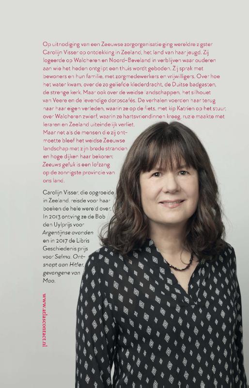 Op uitnodiging van een Zeeuwse zorgorganisatie schreef wereldreizigster Carolijn Visser ‘Zeeuws geluk’, een boek over Zeeland, het land van haar jeugd. Zij logeerde op Walcheren en Noord-Beveland in verblijven waar ouderen aan wie het heden ontglipt een thuis wordt geboden. Zij sprak met bewoners en hun familie, met zorgmedewerkers en vrijwilligers. Over hoe het water kwam, over de zo geliefde klederdracht, de Duitse badgasten, de strenge kerk. Maar ook over de weidse landschappen, het silhouet van Veere en de levendige dorpscafés.