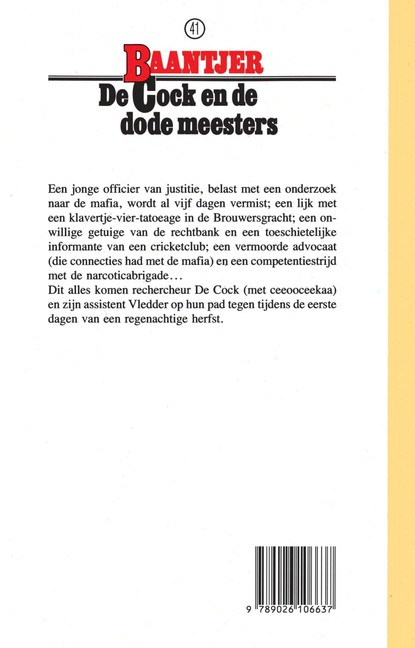 Een jonge officier van justitie, belast met een onderzoek naar de maffia, wordt al vijf dagen vermist; een lijk met een klavertje-vier-tatoeage in de Brouwersgracht; een onwillige getuige van de rechtbank en een toeschietelijke informante van een cricketclub; een vermoorde advocaat (die connecties had met de maffia) en een competentiestrijd met de narcoticabrigade... Dit alles komen rechercheur De Cock en zijn assistent Vledder op hun pad tegen tijdens de eerste dagen van een regenachtige herfst.
