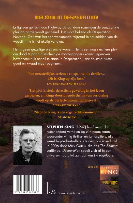 Tenzij je naar Las Vegas gaat voor blackjack of voor een stripshow, is Nevada voornamelijk een uitgestrekte woestijnvlakte waar je doorheen moet op weg naar ergens anders. En met iemand anders, als je geluk hebt… Omdat Nevada, vooral Centraal-Nevada, een enge plek kan zijn. ‘Er wonen veel excentrieke mensen,’ zegt Mary Jacksons vriendin Marielle, maar Marielle heeft er geen idee van hoe excentriek. Want er is iets verschrikkelijk mis in het kleine mijnstadje Desperation en er zijn mensen op Highway 50 die hun bestemming nooit zullen bereiken; mensen die als de zon ondergaat en de wind opsteekt de ware betekenis van de naam Desperation zullen leren kennen.