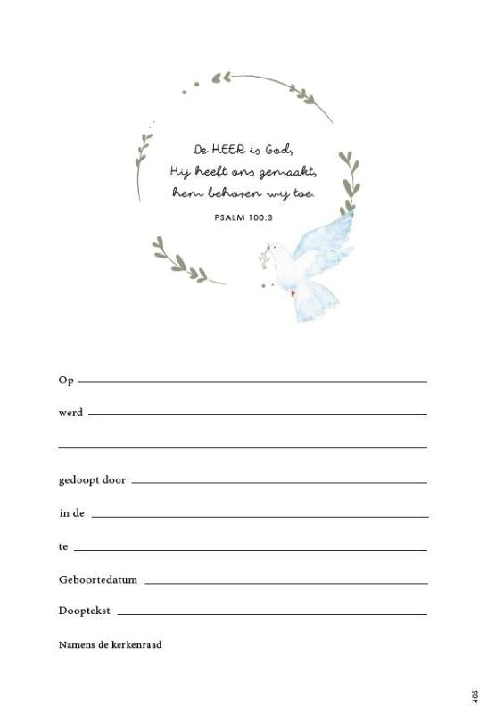 Deze doopkaart (nr. 405) is een mooie herinnering aan de doop. Formaat A5, invulmogelijkheden voor naam, datum, dooptekst enz. Bijbeltekst is in NBV. Wordt geleverd in sets van 10 kaarten.