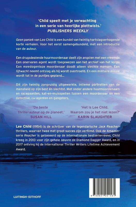 Geen paniek van Lee Child is een bundel van twintig hartslagverhogende korte verhalen. Voor het eerst samen gebundeld, met een introductie van de auteur.