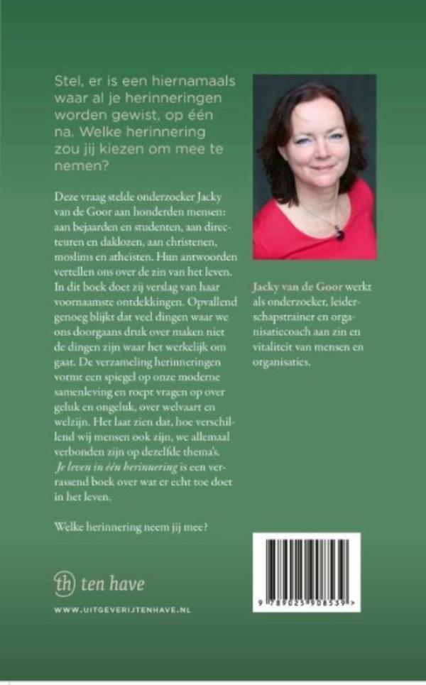 Deze vraag stelde onderzoeker Jacky van de Goor aan honderden mensen. Hun antwoorden vertellen ons over de zin van het leven. In ‘Je leven in één herinnering’ doet zij verslag van haar voornaamste ontdekkingen. Opvallend genoeg blijkt dat veel dingen waar we ons doorgaans druk over maken niet de dingen zijn waar het werkelijk om gaat.