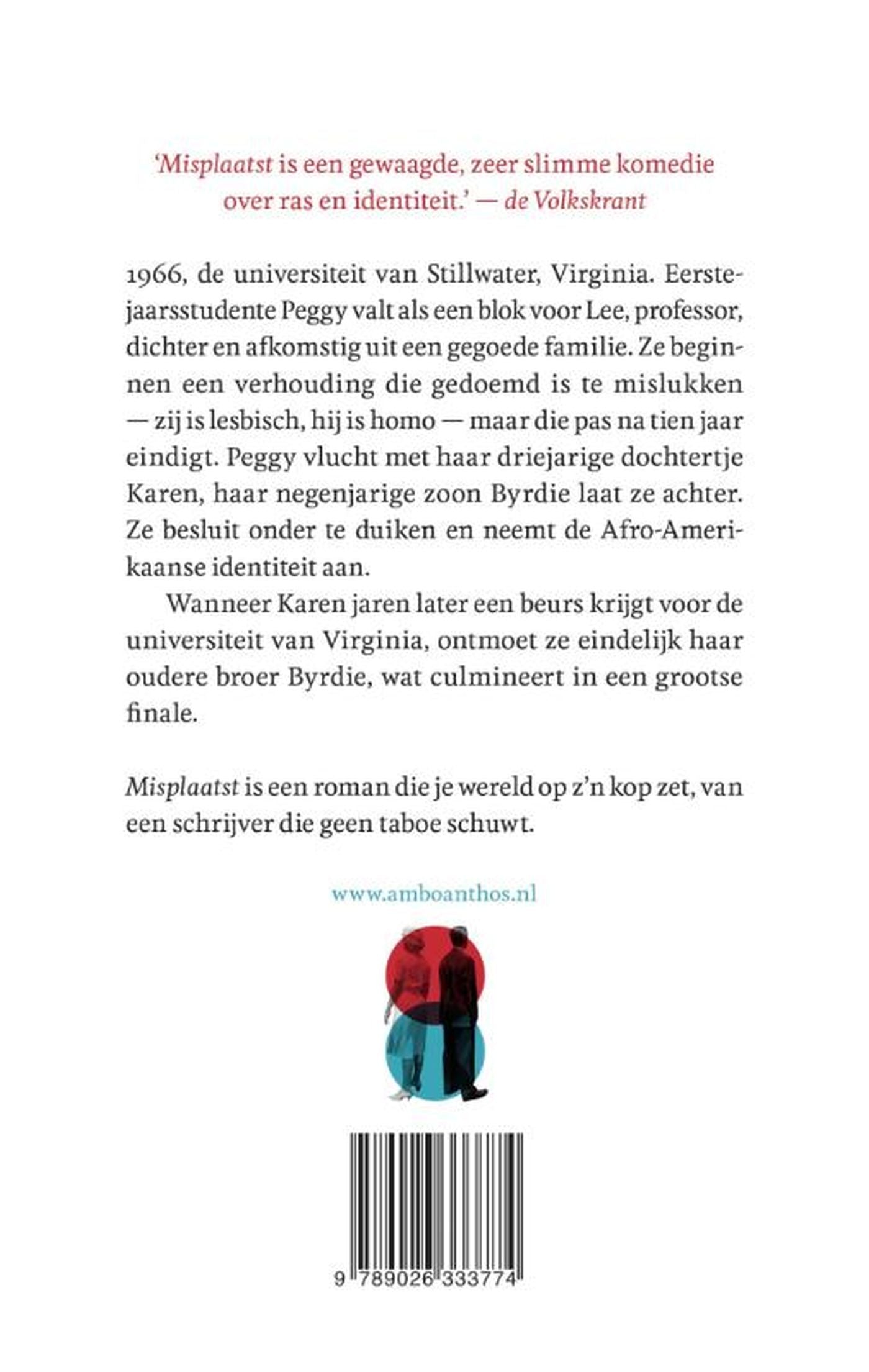 Misplaatst’ is de weergaloze roman van Nell Zink, bekend van ‘De rotskruiper’. 1966, Stillwater College, Virginia. Eerstejaarsstudente Peggy valt als een blok voor Lee, professor, dichter en afkomstig uit een gegoede familie. Ze beginnen een verhouding die gedoemd is te mislukken – zij is lesbisch, hij is homo – maar die pas na tien jaar eindigt. Peggy vlucht met haar driejarige dochtertje Karen, haar negenjarige zoon Byrdie laat ze achter. Ze besluit onder te duiken en neemt de Afro-Amerikaanse identiteit aan.