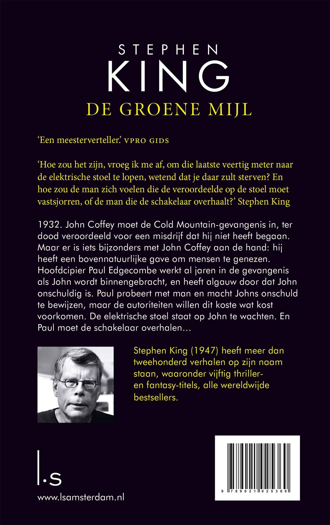 ‘Hoe zou het zijn, vroeg ik me af, om die laatste veertig meter naar de elektrische stoel te lopen, wetend dat je daar zult sterven? En hoe zou de man zich voelen die de veroordeelde op de stoel moet vastsjorren, of de man die de schakelaar overhaalt?’ Stephen King