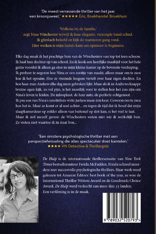 'Welkom bij de familie,' zegt Nina Winchester terwijl ik haar elegante, verzorgde hand schud. Ik glimlach beleefd en kijk de marmeren gang rond. Hier werken is mijn laatste kans om opnieuw te beginnen. Maar ik zal snel ontdekken dat de geheimen van de Winchesters veel gevaarlijker zijn dan de mijne...Elke dag maak ik het prachtige huis van de Winchesters van top tot teen schoon. Ik haal hun dochter op van school. En ik kook een heerlijke maaltijd voor het hele gezin voordat ik alleen ga eten in mijn kleine kamer op de bovenste verdieping.Ik probeer te negeren hoe Nina er een zooitje van maakt, alleen maar om te zien hoe ik het opruim. Hoe ze vreemde leugens vertelt over haar eigen dochter. En hoe haar man Andrew elke dag meer gebroken lijkt. Maar als ik in Andrews knappe bruine ogen kijk, zo vol pijn, is het moeilijk voor te stellen hoe het zou zijn om Nina's leven te leiden. De inloopkast, de luxe auto, de perfecte echtgenoot.Ik pas een van Nina's smetteloze witte jurken maar één keer. Gewoon om te zien hoe het is. Maar ze komt er al snel achter... en tegen de tijd dat ik besef dat mijn slaapkamerdeur op zolder alleen van buitenaf op slot kan, is het veel te laat.Maar ik stel mezelf gerust: de Winchesters weten niet wie ik werkelijk ben.Ze weten niet waartoe ik in staat ben...
