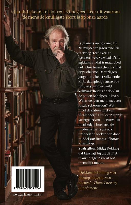 Is de mens nu nog niet af? Na miljoenen jaren evolutie is er nog steeds veel te wensen over. Survival of the sukkels. En dat is maar goed ook. Onvolmaaktheid is juist onze charme. De verlegen jongeman, het struikelende kind en dat spleetje tussen de tanden stemmen mild. Volmaaktheid is de dood in de pot en behelpen is leven. Wat moet een mens met een ideale schoonzoon? Wat moet de natuur met een ideale soort? Het leven wordt voortgedreven door onvolkomenheden, hoe hard de moderne mens die ook probeert te ontkennen door middel van fitness of botox. Koester ze. Zoals alleen Midas Dekkers dat kan legt hij uit dat het tekort hetgeen is dat ons menselijk maakt.