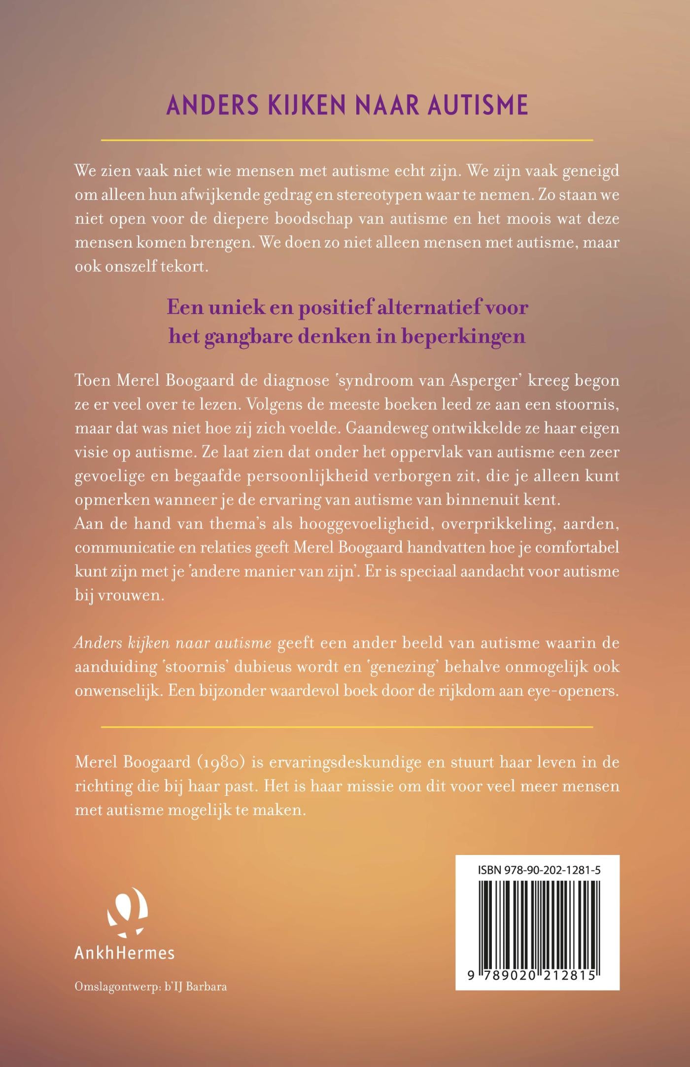 Met Anders kijken naar autisme biedt een uniek en positief alternatief voor het gangbare denken over autisme. Ruim 1% van de Nederlanders, zo’n 190.000 mensen, heeft een vorm van autisme. Ook Boogaard, bij wie Asperger vastgesteld werd, volgens de reguliere benadering een ‘stoornis’, al komt dat niet overeen met hoe zij zich voelt.