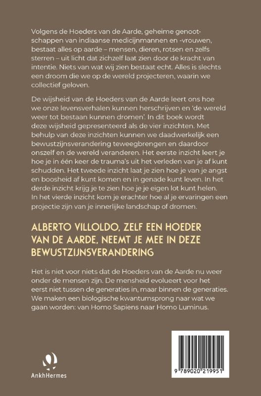 In Alberto Villoldo's 'De hoeders van de aarde' maak je kennis met de vier inzichten. Dit zijn de medicijnmannen en -vrouwen van Amerika, die beschikken over kennis die ze altijd hebben afgeschermd voor de wereld. Volgens deze kennis bestaat alles op aarde uit licht dat zichzelf laat zien door de kracht van intentie. De hoeders van de aarde gebruikten deze inzichten onder andere om ziekten te helen en emotionele problemen op te lossen.