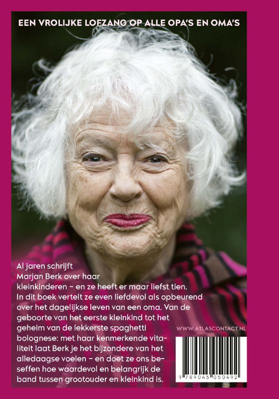 Al jaren schrijft Marjan Berk over haar familieleven. Vaak zijn de kleinkinderen onderwerp van haar schrijven – ze heeft er maar liefst tien. In de verhalen in dit boek vertelt ze even liefdevol als opbeurend over het alledaagse leven van een oma. Van de geboorte van het eerste kleinkind tot het geheim van de lekkerste spaghetti bolognese, en van merkwaardig elektronisch speelgoed tot chaotische familievakanties.