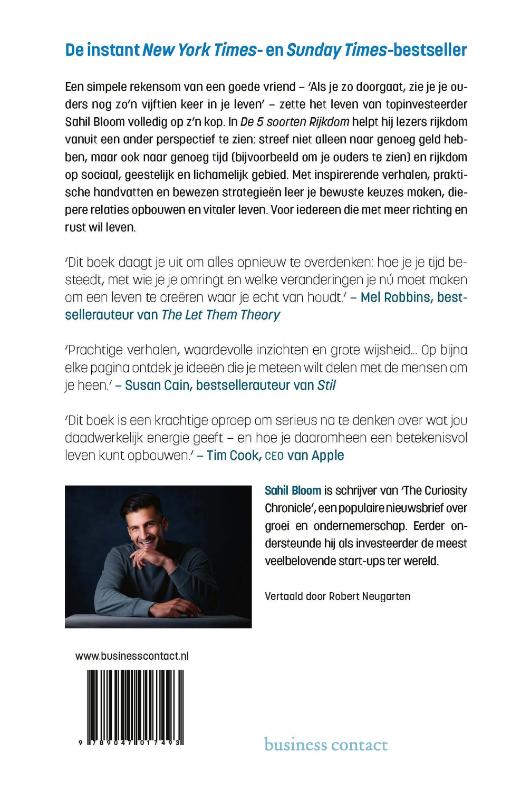 Een simpele rekensom van een goede vriend – ‘Als je zo doorgaat, zie je je ouders nog zo’n vijftien keer in je leven’ – zette het leven van topinvesteerder Sahil Bloom volledig op z’n kop. In De 5 soorten Rijkdom helpt hij lezers rijkdom vanuit een ander perspectief te zien: streef niet alleen naar genoeg geld heb-ben, maar ook naar genoeg tijd (bijvoorbeeld om je ouders te zien) en rijkdom op sociaal, geestelijk en lichamelijk gebied. Met inspirerende verhalen, praktische handvatten en bewezen strategieën leer je bewuste keuzes maken, diepere relaties opbouwen en vitaler leven. Voor iedereen die met meer richting en rust wil leven.