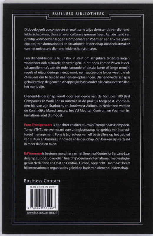 Een dienende leider is bij uitstek in staat om schijnbare tegenstellingen, waaronder ook culturele, te verenigen. In dit boek komen zeven leiderschapsdilemma's aan de orde zoals controle of passie, korte of lange termijn, regels of uitzonderingen; een succesvolle leider weet deze schijnbare tegenstellingen om te buigen naar integrale oplossingen.