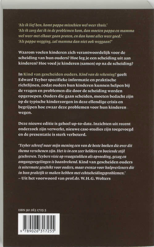 In Kind van gescheiden ouders. Kind van de rekening? geeft Edward Teyber specifieke informatie en praktische richtlijnen, zodat ouders hun kinderen kunnen helpen bij de vragen en problemen die door de scheiding worden opgeroepen. Ouders die gaan scheiden moeten bedacht zijn op de typische kinderzorgen in deze ellendige crisis en begrijpen hoe zwaar deze problemen voor hun kinderen wegen.