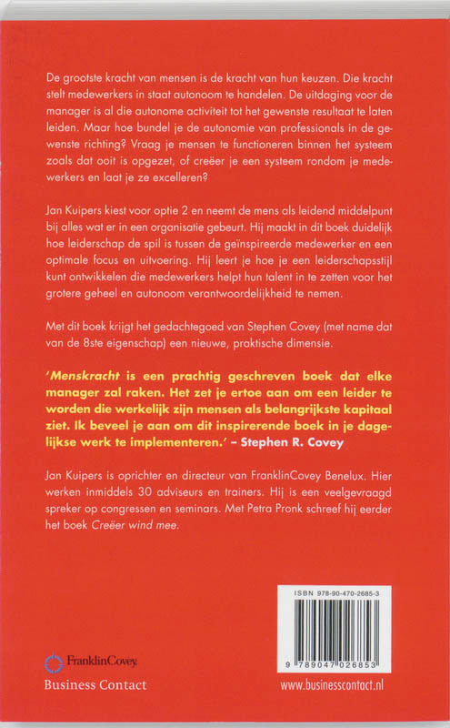 Jan Kuipers neemt de mens als leidend middelpunt bij alles wat er in een organisatie gebeurt. Hij maakt in dit boek duidelijk hoe leiderschap de spil is tussen de geïnspireerde medewerker en een optimale focus en uitvoering. Hij leert je hoe je een leiderschapsstijl kunt ontwikkelen die medewerkers helpt hun talent in te zetten voor het grotere geheel en autonoom verantwoordelijkheid te nemen.