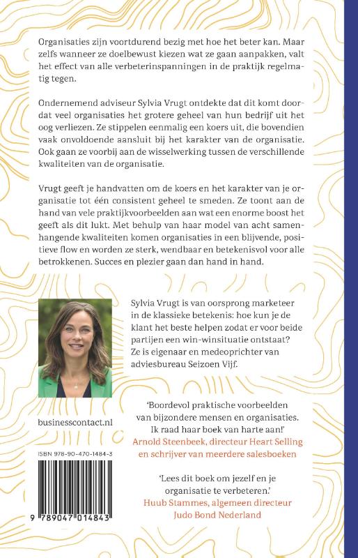 Sylvia Vrugt geeft je in ‘Op koers op karakter’ handvatten om de koers en het karakter van je organisatie tot één consistent geheel te smeden. Ze toont aan de hand van vele praktijkvoorbeelden aan wat een enorme boost het geeft als dit lukt. Met behulp van haar model van acht samenhangende kwaliteiten komen organisaties in een blijvende, positieve flow en worden ze sterk, wendbaar en betekenisvol voor alle betrokkenen. Succes en plezier gaan dan hand in hand.