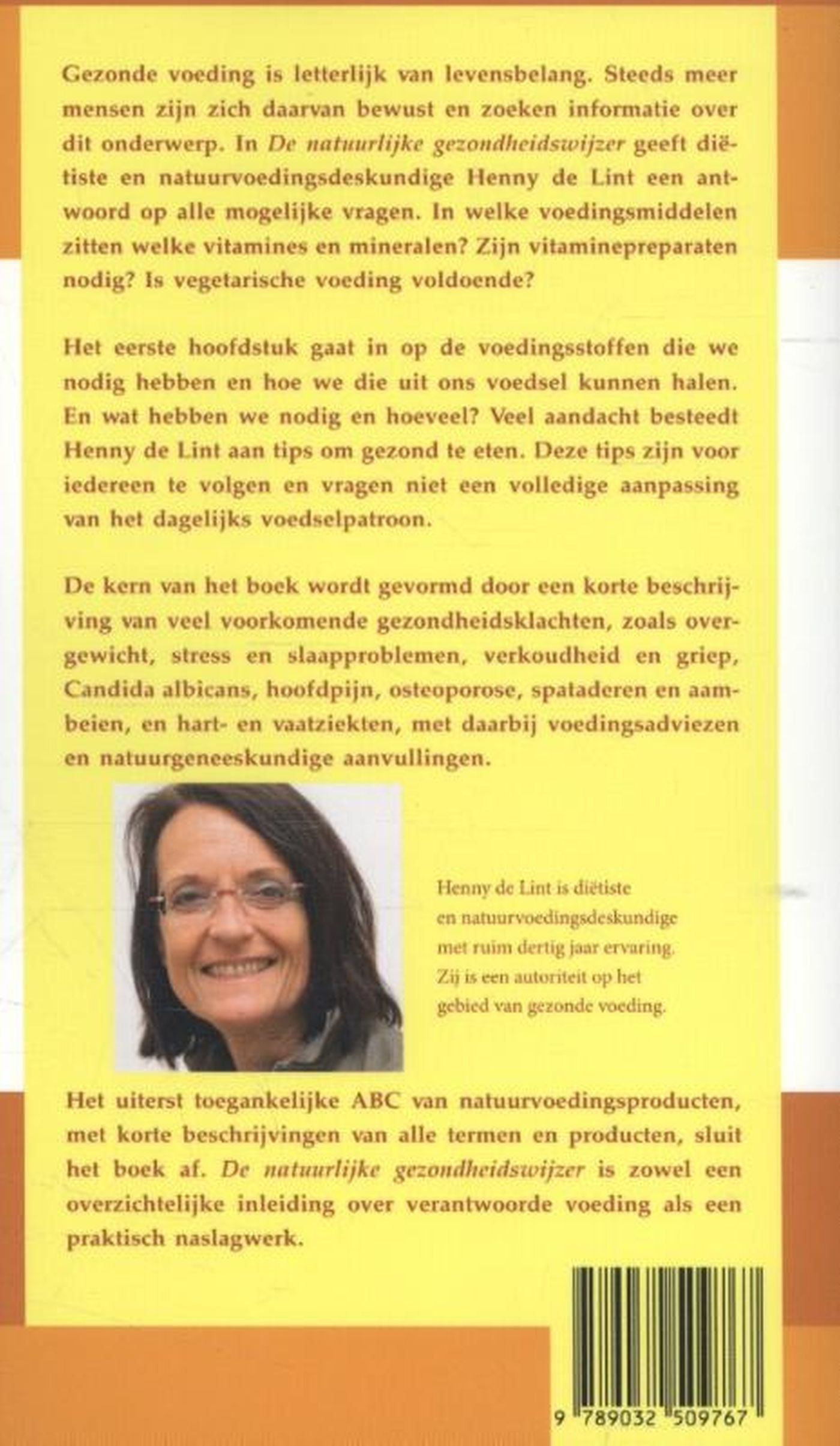 Gezonde voeding is letterlijk van levensbelang. Steeds meer mensen zijn zich daarvan bewust en zoeken informatie over dit onderwerp. In De natuurlijke gezondheidswijzer geeft diëtiste en natuurvoedingsdeskundige Henny de Lint een antwoord op alle mogelijke vragen. In welke voedingsmiddelen zitten welke vitamines en mineralen? Zijn vitaminepreparaten nodig? Is vegetarische voeding voldoende?