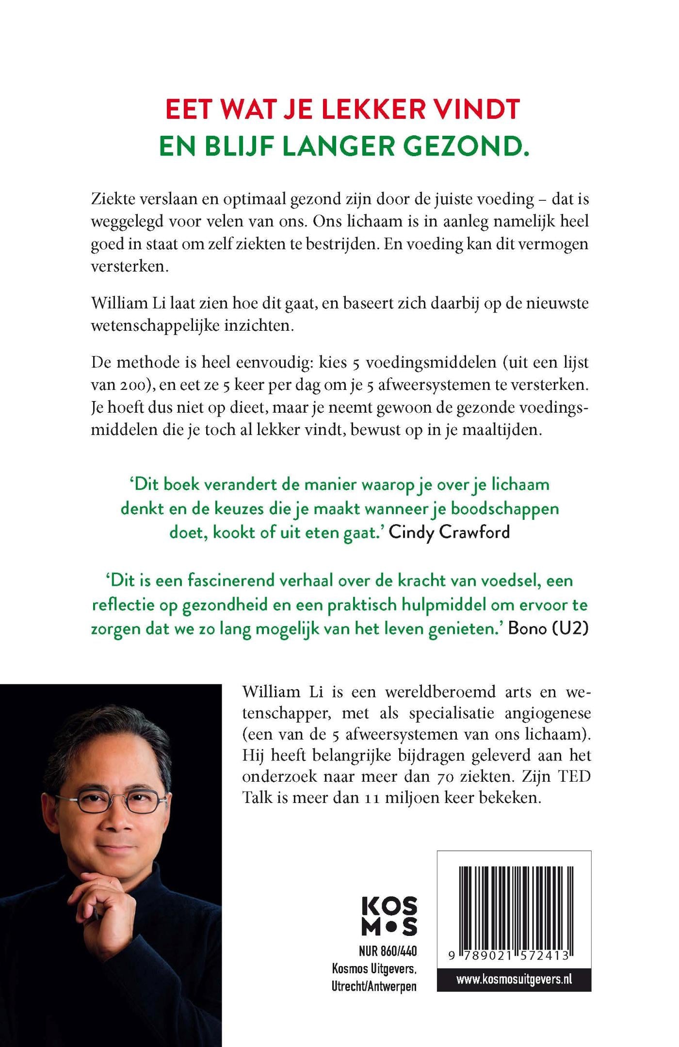 Baanbrekend arts en wetenschapper dr. William Li bewijst in 'Eet om ziekte te verslaan' dat meer dan 200 gezondheidsbevorderende voedingsmiddelen o.a. kanker kunnen vertragen, het risico op dementie kunnen verminderen en ook tientallen andere ziekten kunnen tegengaan.